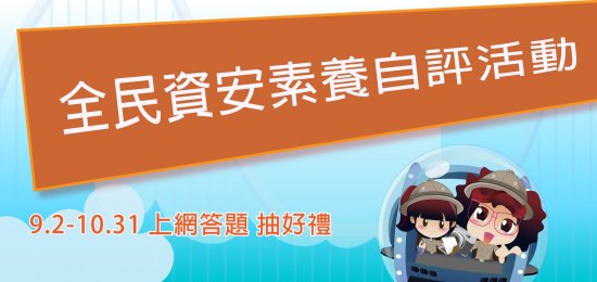 一、為提升全民資安素養與電腦防護能力,本部自 9 月 2 日至 10 月 31 日舉辦「全民資安素養自我評量」活動,敬請協助將 banner 電子檔置於貴單位或所屬機關(構)網站上,並連結本活動網站(網址: https://isafeevent.moe.edu.tw/),以鼓勵貴單位人員於活動期間內踴躍上網檢測資訊安全素養認知程度,並有機會參與抽獎。