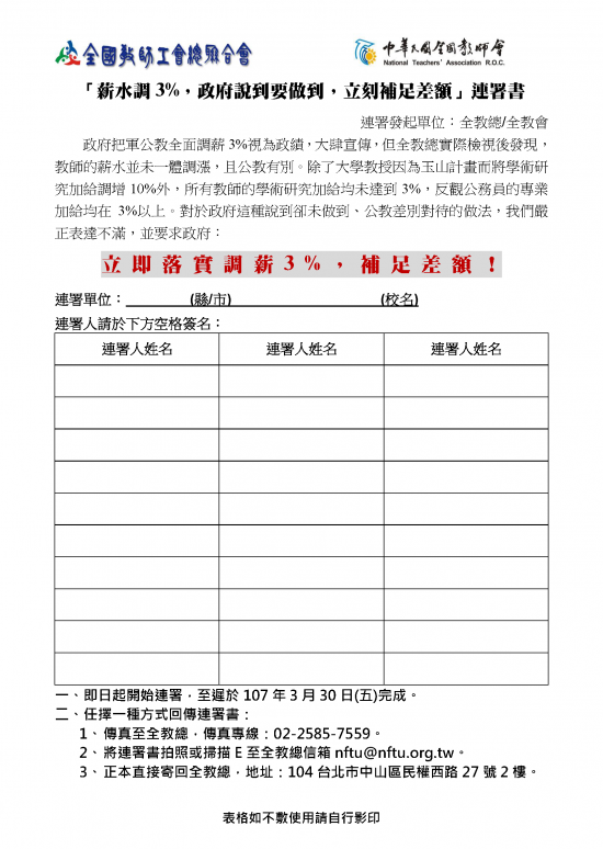 主 旨:敬請共同參與『薪水調 3%,政府說到要做到,立刻補足差額』連署行動,並於本〈107〉年 3 月 30 日前依連署書說明,選定回傳方式,你我展現教職人員共同意志,要求公平合理之權益,請協處。